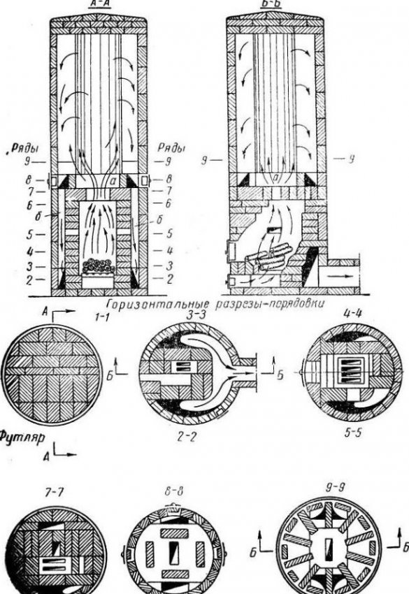 Схематичное изображение функционирования печи с горизонтальными разрезами-порядовками помогает лучше понять специфику выкладывания кирпичей
