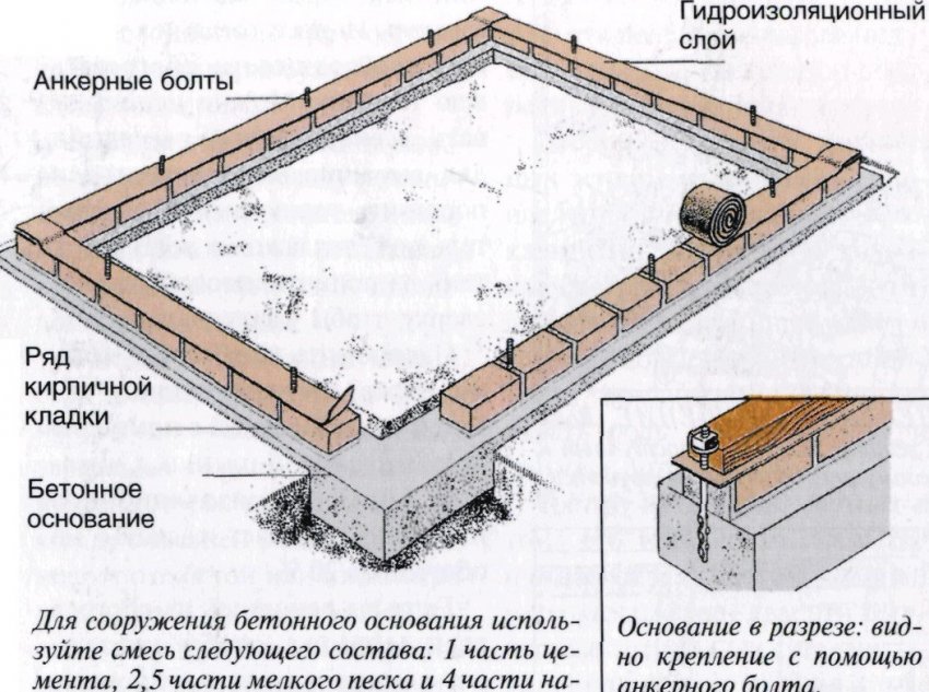 Для фундамента используется брус сечением 100х150 или 150х150 мм
