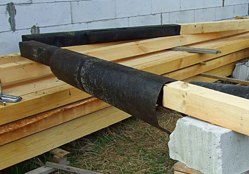 - Брус дважды обрабатывается антисептиком, после чего обматывается пергамином. Последний можно пристрелить строительным степлером.