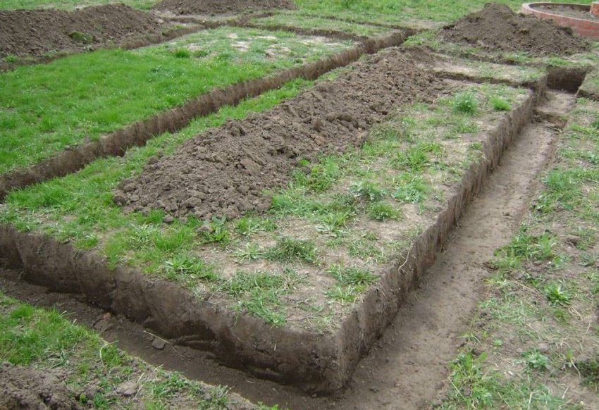 - Вырыть по периметру траншею несколько большей ширины, чем будущий фундамент. Оптимальная ширина бетонной ленты составляет 35–40 см.