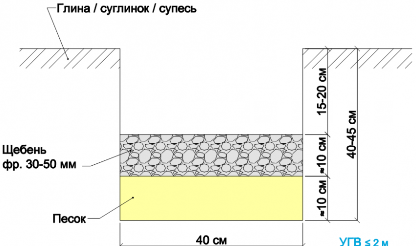 - Принять глубину заложения равной 0,5 м, но остальной грунт до глубины промерзания вынуть и заменить хорошо утрамбованным песчаным. Ширина песчаной засыпки должна несколько превосходить ширину фундамента.