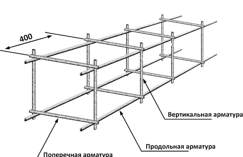 - Для более крупных построек в фундаменте закладывается полноценный каркас: сверху и снизу — рабочие пояса по три продольных ряда арматурных прутьев диаметром 10–12 мм, всё это связывается вертикальной и горизонтальной поперечной арматурой диаметром 6 мм. Соединять элементы каркаса сваркой нельзя — арматура в зоне сварного шва утрачивает прочность. Их необходимо связывать отожжённой проволокой.