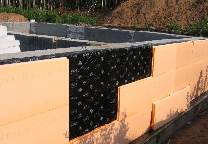 Располагать утеплитель, как и в случае с кирпичными стенами, следует по возможности снаружи. В противном случае конструкция окажется изолированной от тёплого внутреннего пространства, а значит, она будет сильнее промерзать. Как было сказано выше, из-за давления промерзающего грунта в качестве утеплителя нужно применять экструдированный пенополистирол или другой прочный материал. Пенополистирольные листы лучше использовать со специально подрезанными торцами, которые исключают наличие сквозных швов. Если же листы используются обычные, швы между ними следует задуть пенополиуретаном (монтажная пена). Пенополистирол монтируется так: