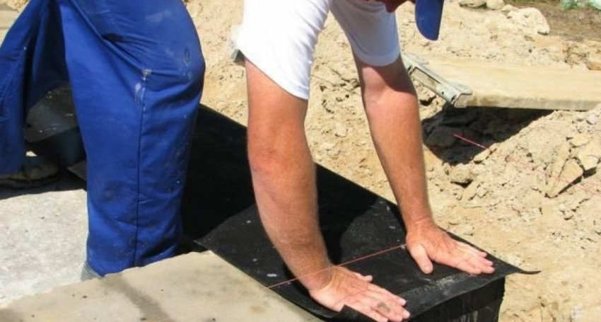Уложить гидроизоляционный материал на застывший фундамент можно методом напыления или наклеиванием на битумную мастику
