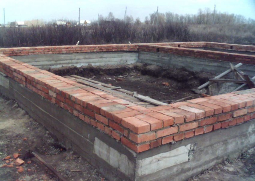 Цокольный ряд выкладывается из полнотелого красного кирпича на цементном растворе