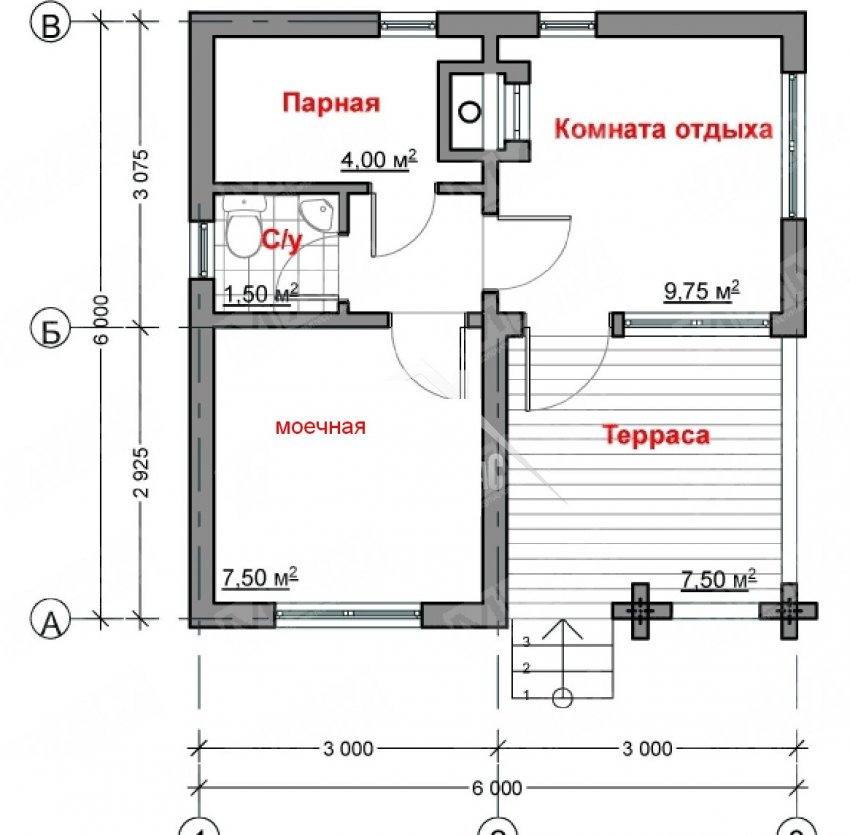 В бане размером 6х6 м можно разместить комнату отдыха, террасу и даже санузел