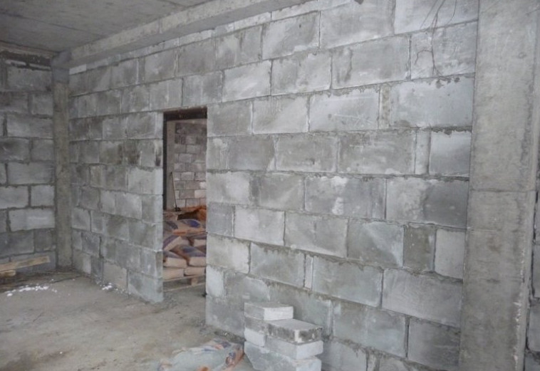 - Выполняют кладку внутренних перегородок из блоков толщиной 90–120 мм или кирпича, не забывая про дверные проёмы и перемычки.