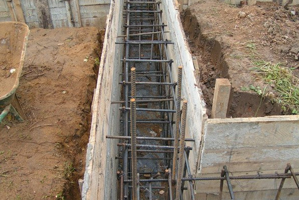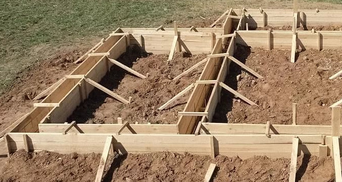 Перед заливкой фундамента в выкопанной траншее сбивается опалубка, которая укрепляется поперечными подкосами и распорками
