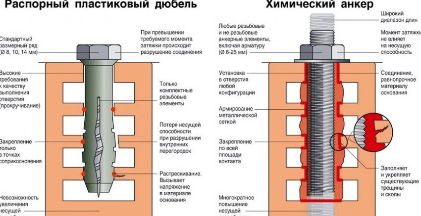 Распорный дюбель удерживается в стене за счёт сил трения в распорном соединении, а химический анкер — за счёт адгезии специального клеевого состава