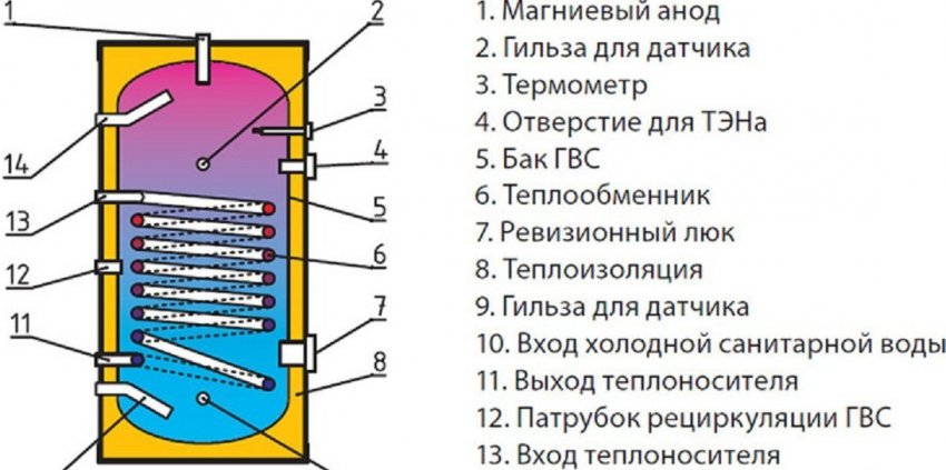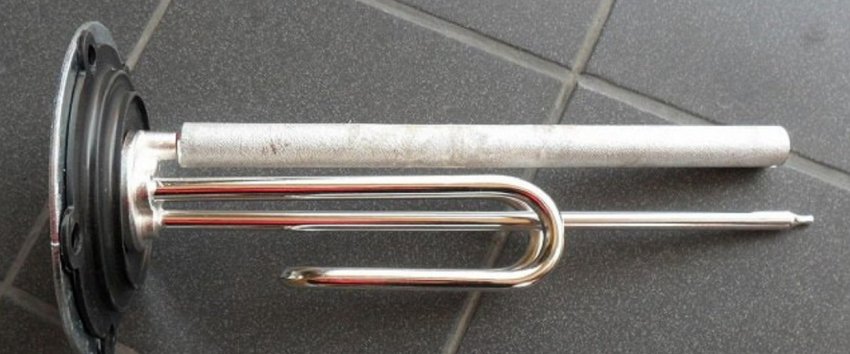 Он изготавливается в виде тонкого круглого стержня диаметром 14–25 мм и длиной 140–660 мм с нанесением на поверхность слоя магниевого сплава толщиной до 15 мм. В непосредственной близости от ТЭНа анод крепится с помощью резьбовой шпильки, находящейся в центре стержня. Иногда анод размещают на верхней стенке внутреннего бака.