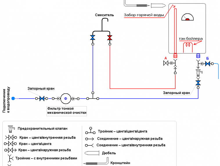На схеме установки бойлера необходимо указать последовательность подключения приборов и тип используемой запорной арматуры