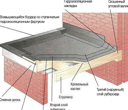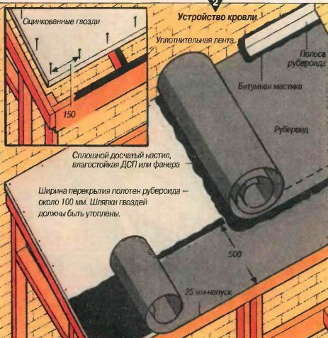 Рубероид укладывается на сплошной настил из дерева или бетона, покрытый битумной мастикой, с нахлёстом между полотнами