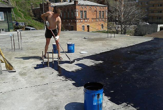 - На чистое и сухое основание наносят битумную грунтовку. Она хорошо проникает в поверхность. Лучший вариант грунтовки — готовая жидкая мастика для кровли. Работа выполняется валиком либо кистью для малярных работ.