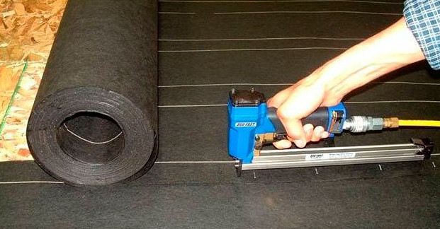 Крепёж первого слоя гидроизоляции производится скобами или гвоздями