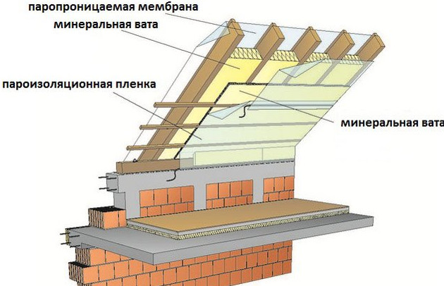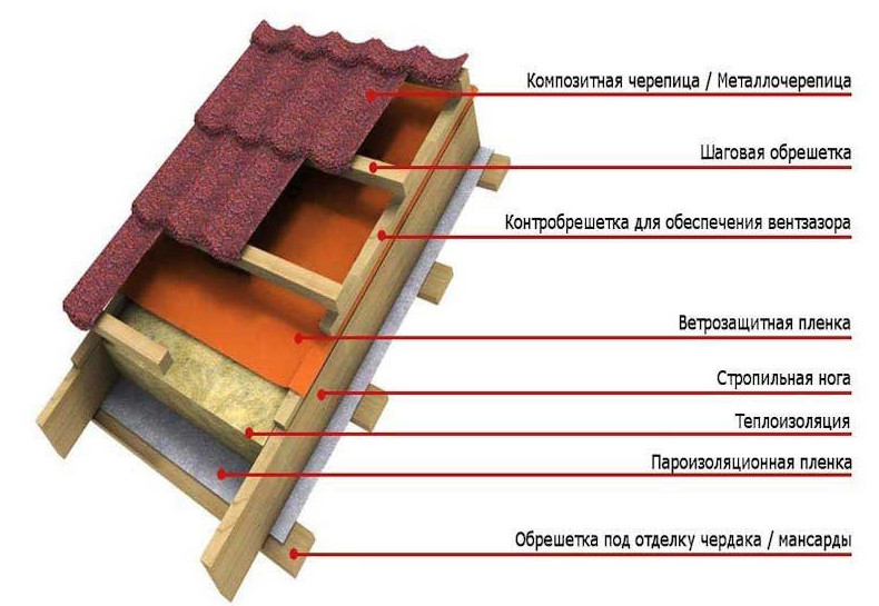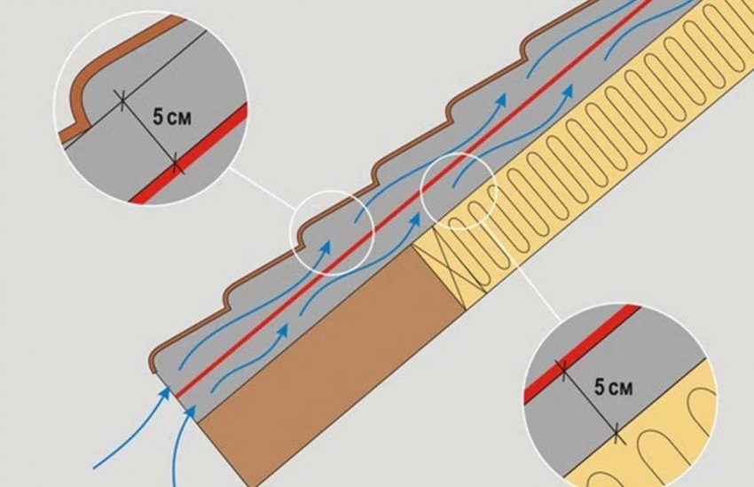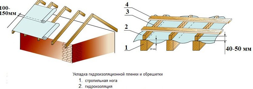 Зазор над гидроизоляционной плёнкой служит для удаления конденсата с внутренней поверхности кровельного покрытия, а под ней — предотвращает намокание утеплителя от проходящих через него паров влажного воздуха