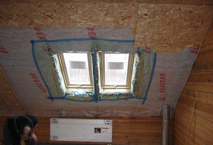 - Особое внимание нужно уделить примыканиям к мансардным окнам, люкам и т. д. Они обычно комплектуются пароизоляционным фартуком. Вместо него периметр рамы можно оклеить двусторонней бутиловой лентой.