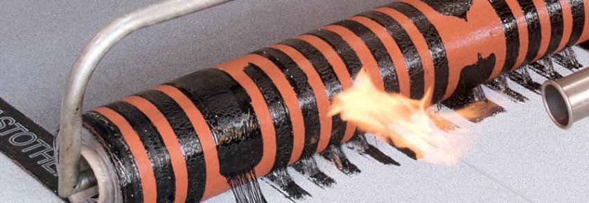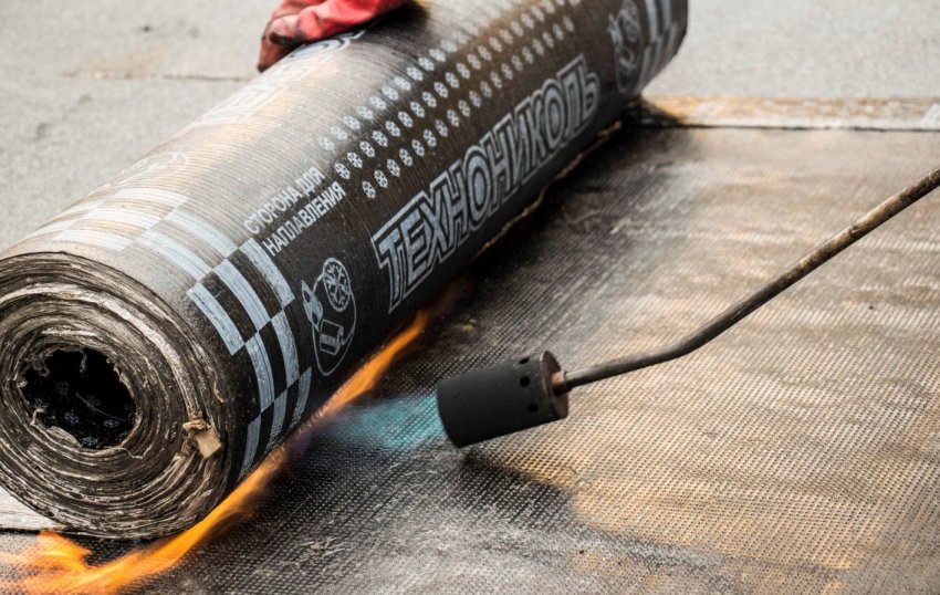 - Когда она высохнет, можно укладывать материал. Здесь начинаются различия. Вместо приклеивания на мастику полотнище разогревается горелкой. Однако нужно следить, чтобы не было перегрева, иначе материал станет хрупким. Клеить можно, когда изображение на прилегающей поверхности деформируется. Для прикатки очень удобно использовать деревянную швабру. При соблюдении технологии из стыков будет выступать небольшое количество битума.