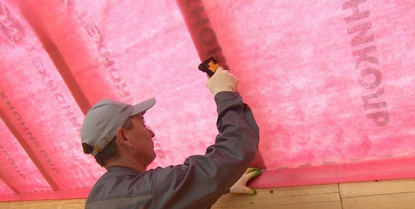 - При помощи строительного степлера плёнка полотно закрепляется на одной стороне, а затем по стропилам. Допустимо провисание между стропилами не более 2 см. В противном случае влага будет задерживаться на плёнке и попадать в подкровельное пространство.