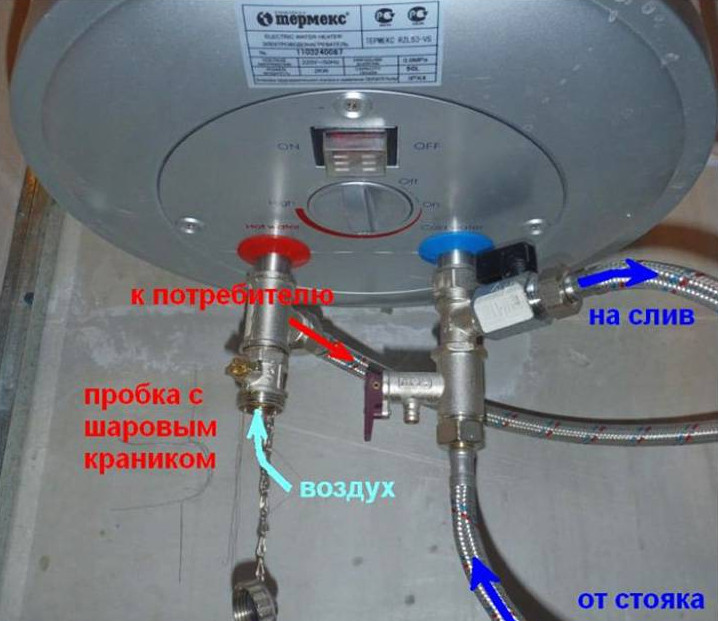 - для быстрого сброса воды из бака между вентилем и нагревателем необходимо установить тройник с шаровым краном.