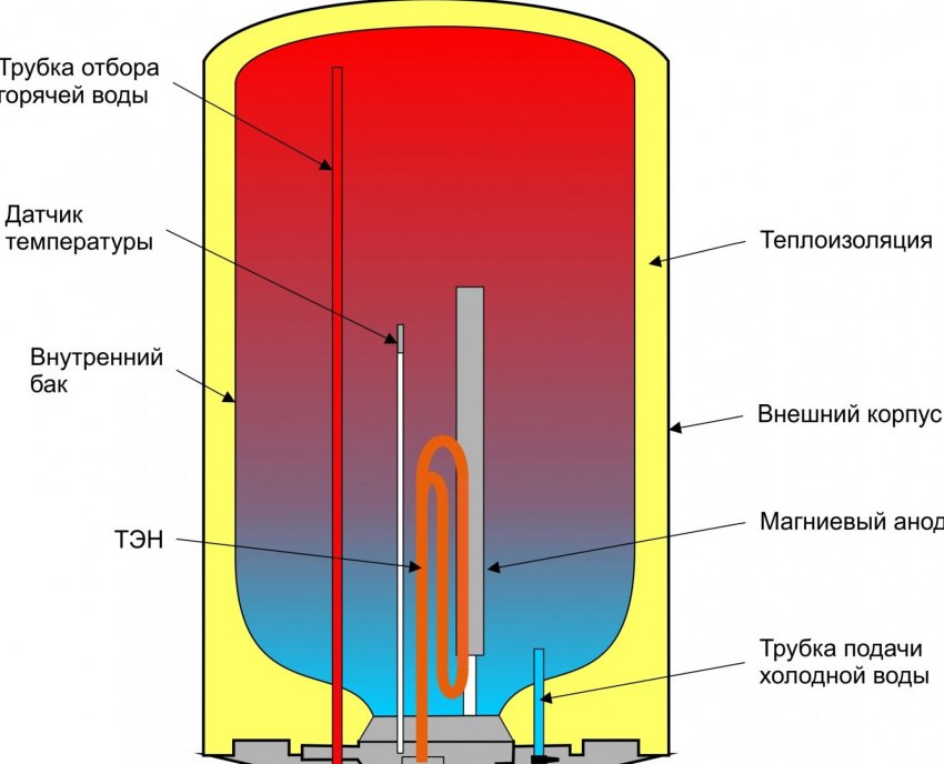 Бойлер представляет собой герметичный бак, внутри которого находятся элементы, необходимые для нагревания воды и обеспечения долговечной и безопасной эксплуатации прибора