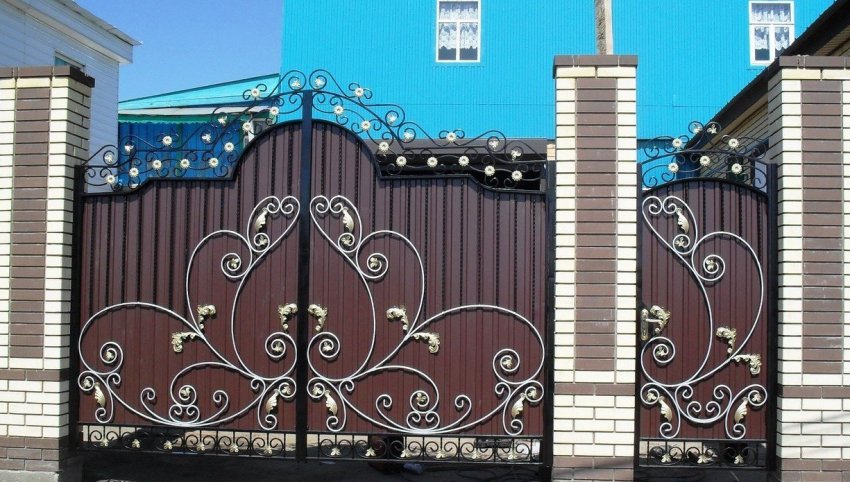 На фото ниже представлен пример более удачного сочетания ворот с ограждением по цвету и стилю. Этот вариант выполнен практически из тех же материалов. Элементы простейшей ковки из прутка доступны для самостоятельного изготовления.