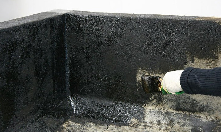 - Если стена сложена из кирпича, на место соединения нанесите слой штукатурки, хорошо выровняйте шпателем и оставьте до полного высыхания. На стену из бетона нанесите битумную основу (праймер).