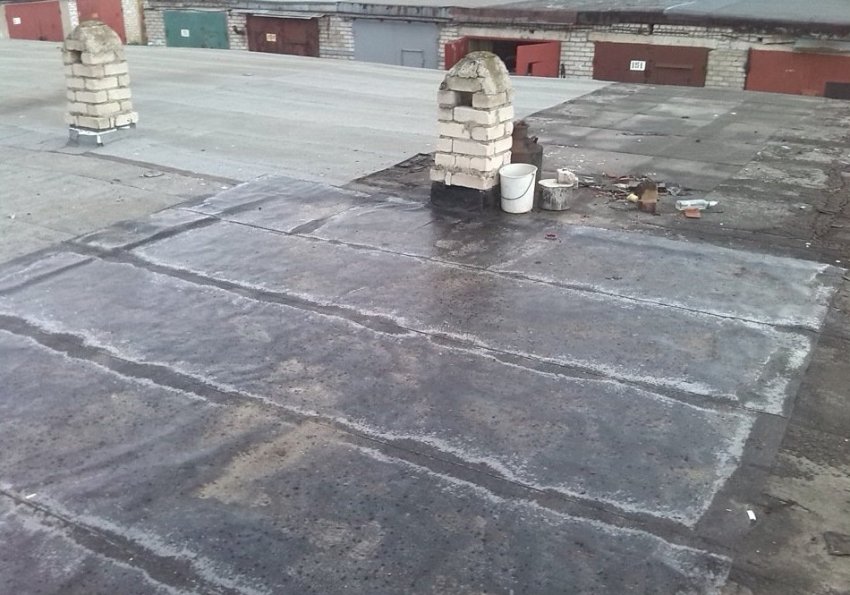 - крышу, покрытую старым рубероидом, очищают от этого материала, находят трещины и замазывают их битумной мастикой. При необходимости можно обработать всю поверхность гидроизолирующим составом;