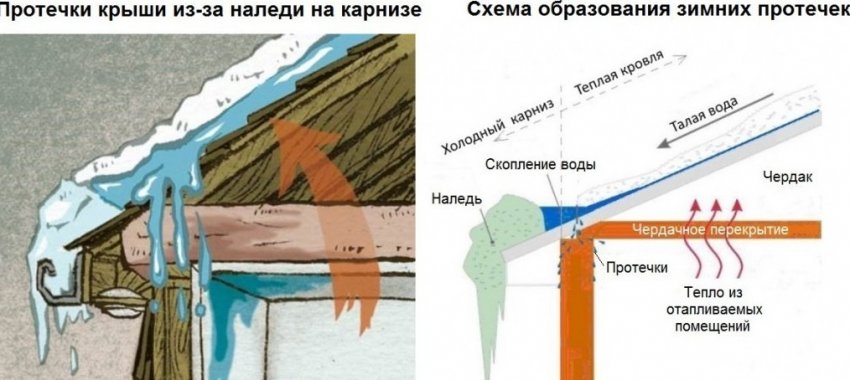 Протечки могут возникнуть и в зимнее время года из-за частичного оттаивания льда и скопления воды в месте перехода тёплой кровли в холодную