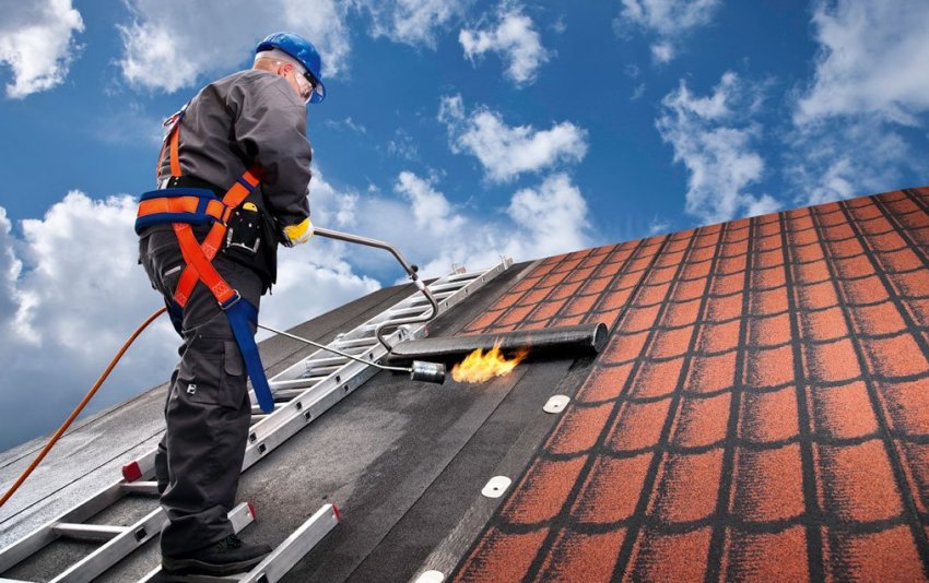 - На крышу наносят битумный праймер, необходимый для улучшения адгезии материала с поверхностью кровли и дожидаются высыхания состава. Далее раскатывают небольшую часть рулона от угла крыши и с помощью газовой горелки или строительного фена прогревают нижнюю часть полотна, раскатывая рулон по мере необходимости.