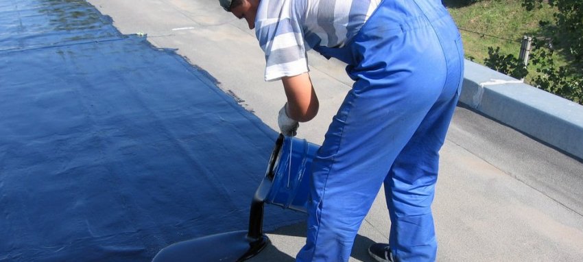 - на новой крыше из бетонных плит, не оснащённой гидроизоляцией, делают бетонную стяжку для выравнивания поверхности, что позволит предотвратить скопление влаги. После этого на высохшую поверхность наплавляют рубероид или наносят битумную мастику. Эффективна также жидкая резина. Этими материалами обрабатывают всю поверхность;