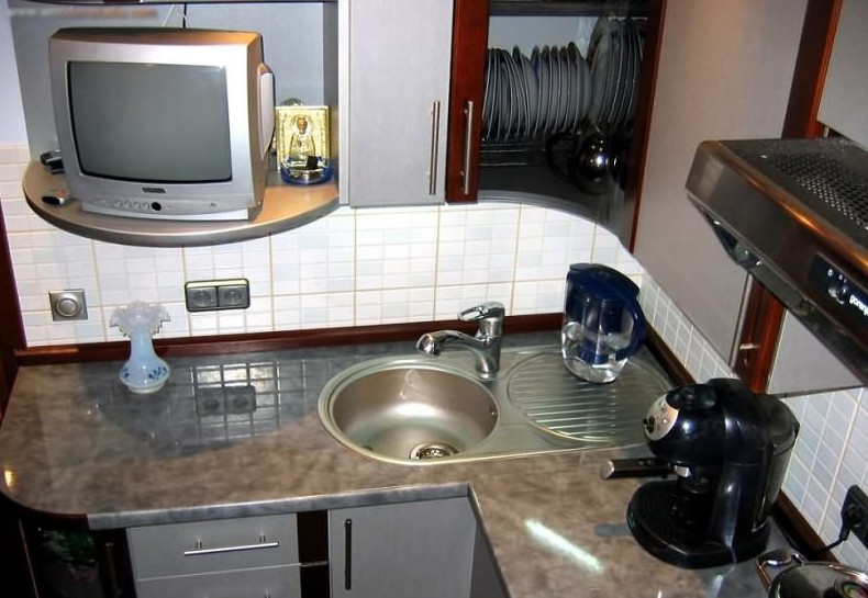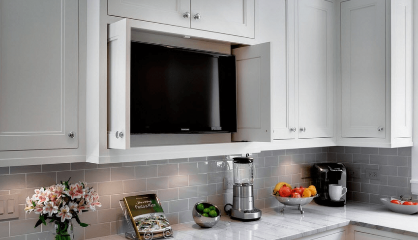- встроить телевизор в гарнитур и использовать приборы попеременно. Пока работает микроволновка, телевизор необходимо и закрывать дверцами шкафчика;