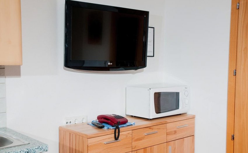Установленный на полке кухонного гарнитура, телевизор сможет безболезненно перенести соседство с микроволновой печью