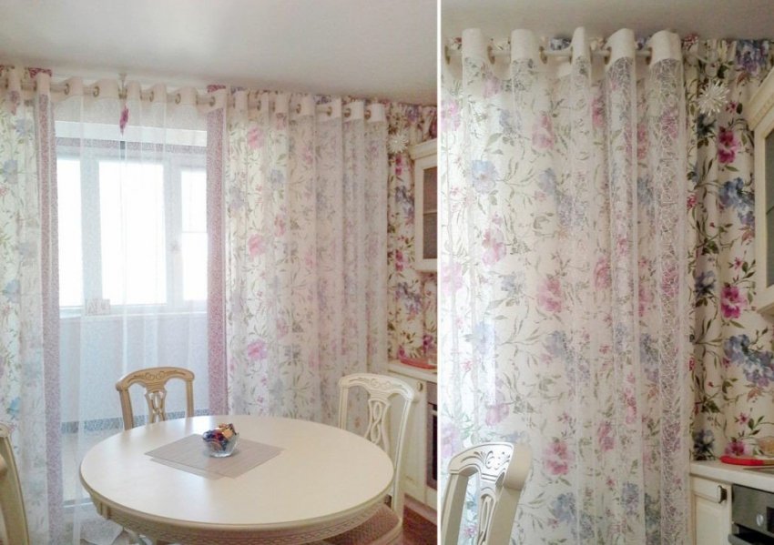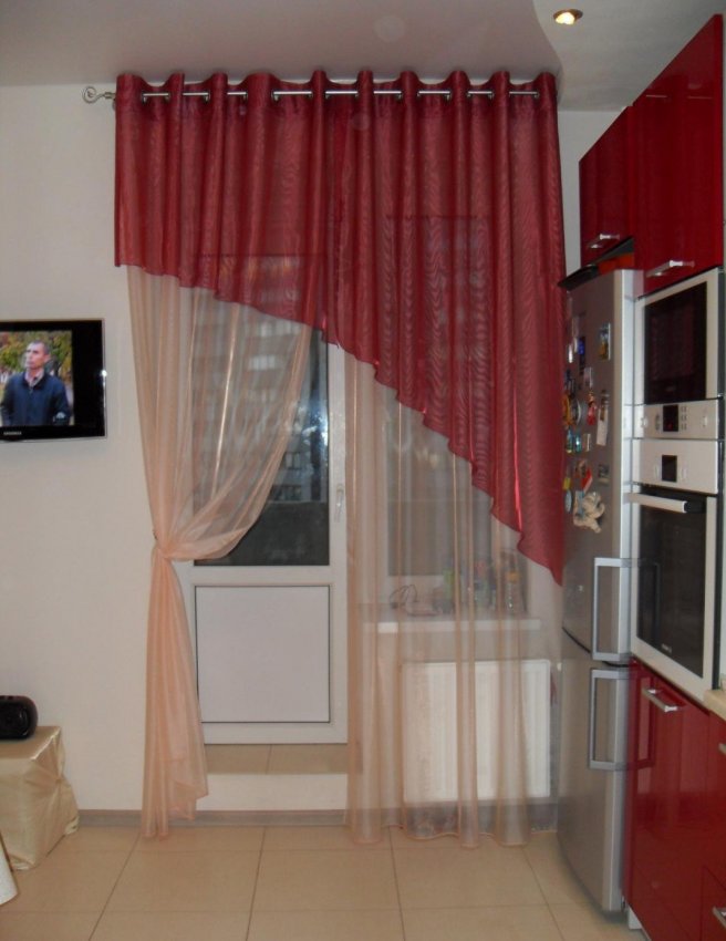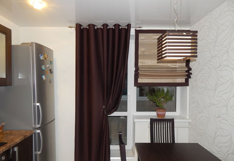 - если на кухне есть окно с балконной дверью, то его стоит дополнить рулонной шторой и портьерой на люверсах. При этом используются занавески одинаковой плотности;