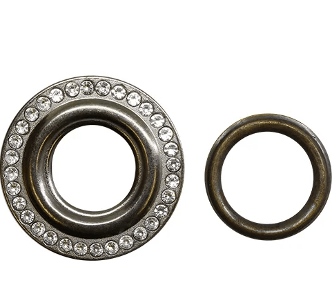 - кольца-люверсы со стразами выделяются на фоне однотонных кухонных занавесок и придают декору окна блеск, эффектность. При выборе стоит обратить внимание на надёжность крепления стразов, ведь во время стирки штор элементы могут повредиться. Одним из распространённых вариантов является люверс Nika, имеющий круглую форму, диаметр 15 мм и украшенный блестящими деталями. Цена за 1 штуку составляет около 139 р.;