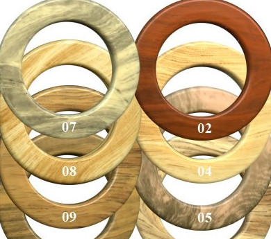 - элементы с орнаментом прекрасно подходят для лаконичных штор. Встречаются кольца в полоску, с крапинками и другим рисунком. Расцветка под натуральную древесину — наиболее распространённый вариант. Российская фирма «Гамма» представляет широкий выбор таких изделий, из которых особенно выделяются пластиковые люверсы под дерево, имеющие диаметр 35 мм. Их стоимость составляет около 57 р. за 1 штуку.