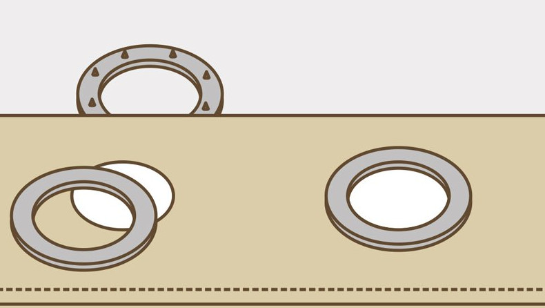 - если ткань неплотная, то в месте расположения колец следует прикрепить прочную ленту, ширина которой немного больше диаметра люверсов.