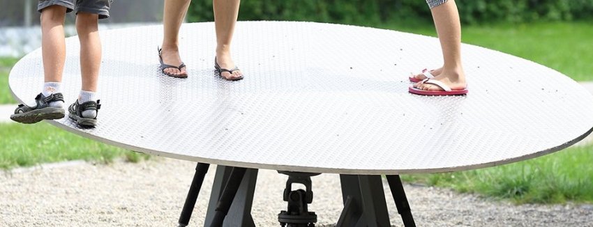- «Большой вращающийся диск»: ось наклонена, большая платформа вращается из-за силы тяжести, когда дети переползают по ней. Достоинство — развивает силу, ловкость, хваткость. Недостаток — кроме подшипников нуждается в прочной пружине большого диаметра, которую крайне трудно найти при домашнем строительстве карусели.