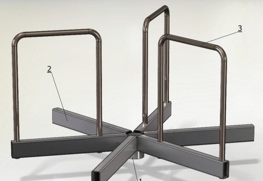 Основание площадки карусели собирается из деталей: 1 — подшипниковый корпус (труба 90 х 7); 2 — труба прямоугольная 80х40х4; 3 — ручка (труба 25 х 6)