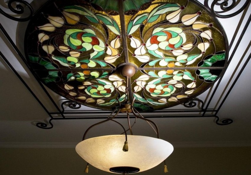 - Потолочные светильники. Большие стеклянные плафоны или акриловые вставки в потолок придадут интерьеру оригинальность.Готический интерьер украсит потолочный витраж