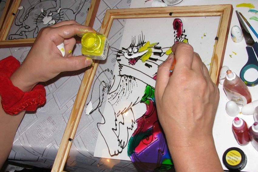 Прежде чем приступить к работе, подготовьте всё необходимое. Для расписного и заливного витража понадобятся краски.