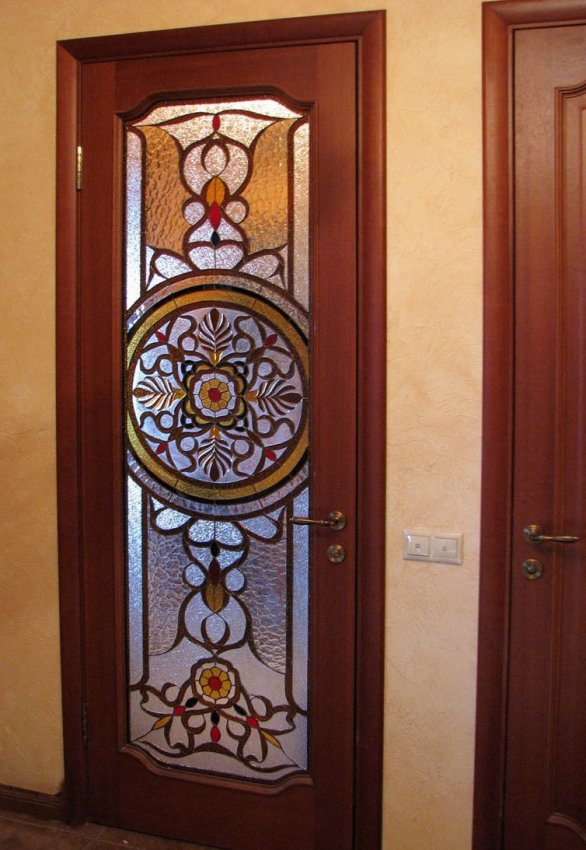 - Двери. Декорировать можно как полностью стеклянные двери, так и стеклянные вставки. Рисунок лучше выполнить в одной стилистике на всех дверях.Рисунок на всех дверях лучше выдерживать в одной стилистике