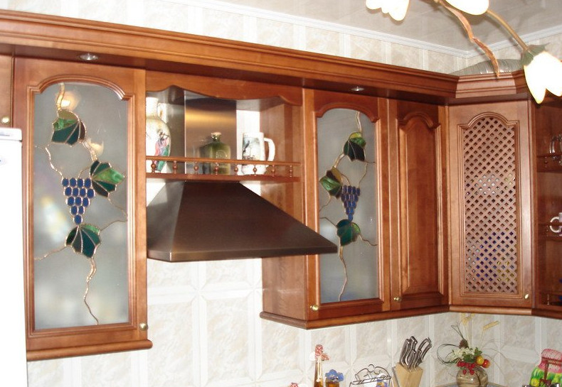 - Мебельные фасады, стеклянные столешницы. Декорирование мебели витражом — хороший способ придать ей индивидуальность. Даже старая мебель, украшенная витражом, смотрится дорого и роскошно.![]() Витражные вставки уместны как для мебели в гостиной, так и для кухни
