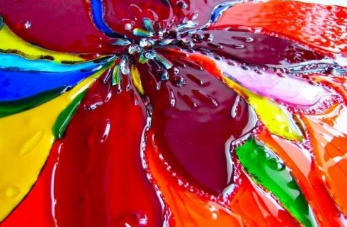 - Фьюзинг. Витраж изготавливается без металлического обрамления путём спекания разноцветных фрагментов в монолитный рисунок. Дома изготовить такой витраж невозможно, требуется специальная печь с высокой температурой.![]() Витраж в технике фьюзинг поражает яркостью красок и цельностью композиции