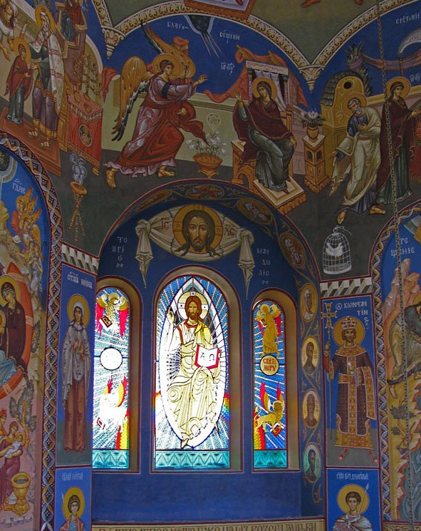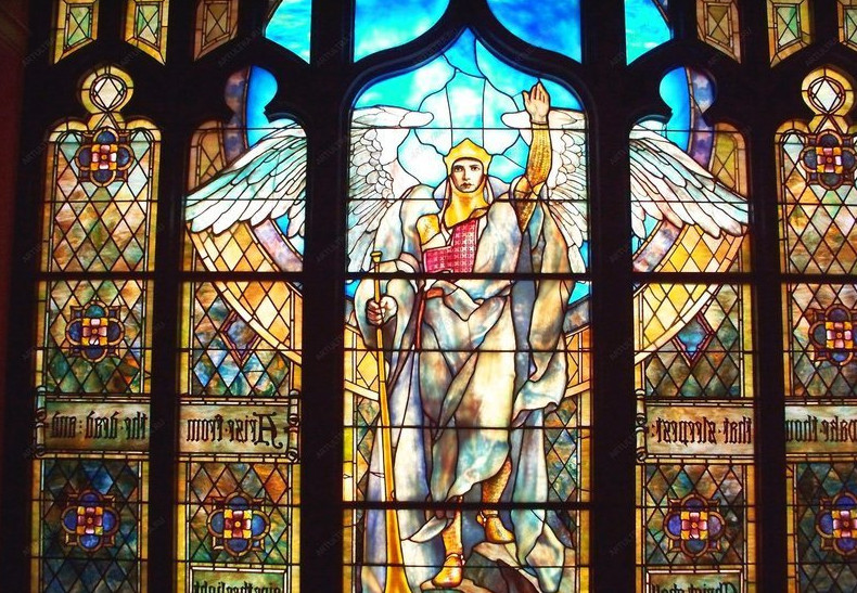 - Византийский. Отличает использование не только цветного, но и прозрачного стекла, отчего изображение кажется висящим в воздухе. Такие витражи напоминают роспись по стеклу, подходят для помещений, наполненных светом.![]() Применение прозрачного стекла в византийском стиле создаёт иллюзию парения рисунка в воздухе