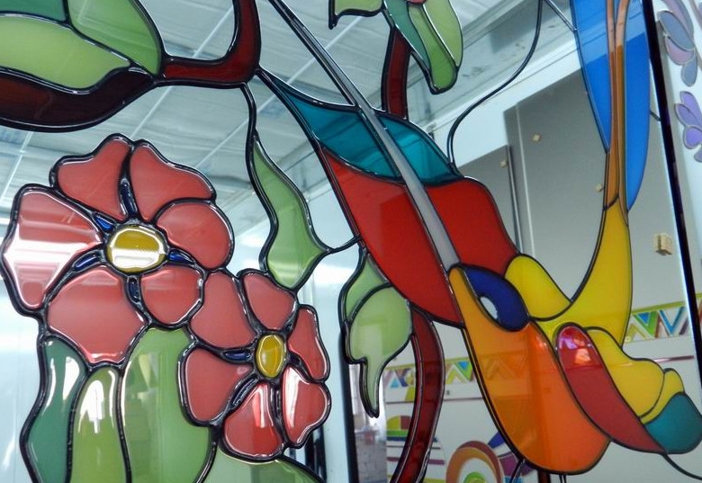 - Английская или плёночная. Рисунок формируется на стекле из витражной самоклеящейся плёнки. Каждый фрагмент вырезается отдельно и приклеивается на место, определённое трафаретом. Наклеенные фрагменты обрамляются свинцовой лентой. При определённых навыках, такой витраж можно изготовить самостоятельно.
