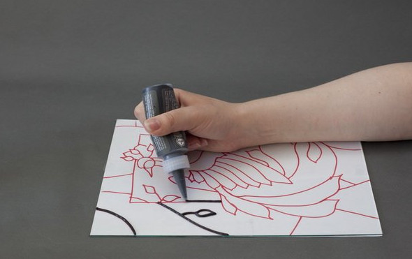 - Перенесите контуры рисунка с трафарета на стекло специальным исчезающим маркером. Если у вас есть опыт в рисовании, линии можно наносить сразу контуром или контурной пастой.![]() Нанесение контура требует аккуратности и точного глазомера
