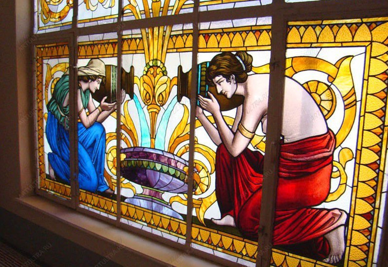 - Античный. Картины напоминают античную мозаику с древнегреческими сюжетами. Характерно присутствие множества мелких деталей. Подходят для помещений в минималистическом стиле.![]() Витраж в античном стиле зачастую является законченным произведением