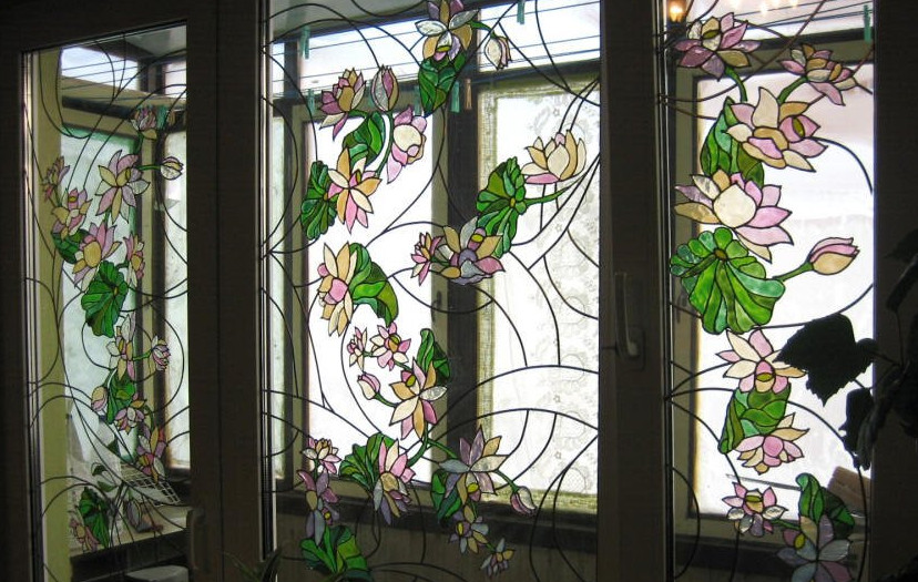 - Окна. Витраж придаст спальне ощущение уюта, а детской — сказочности. Витраж в окне можно использовать в качестве защиты от солнца, скрыть от посторонних глаз ванную, добавить праздничности и уюта на кухне.![]() Цветочный рисунок на балконном окне создаст иллюзию загородного дома