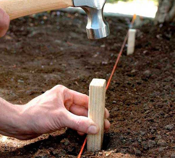 - При помощи верёвки, натянутой на вбитые в землю колышки, наметить контур будущей грядки-клумбы. Форма может быть разной, а ширина не должна превышать 1 метра, во избежание трудностей с поливом и прополкой в дальнейшем.![]() Контур будущей грядки намечают с помощью вбитых в землю колышков и натянутой между ними верёвки