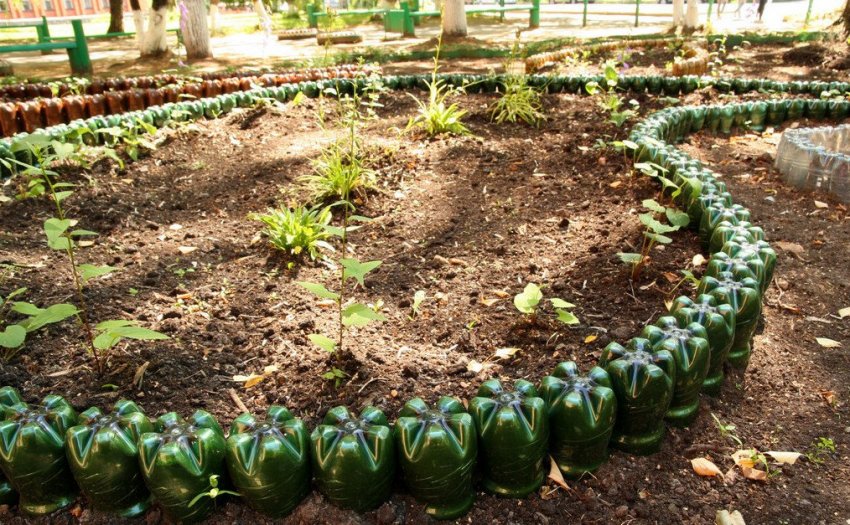 Не нужно выбрасывать пустую пластиковую тару: из бутылок можно соорудить отличное ограждение для грядок